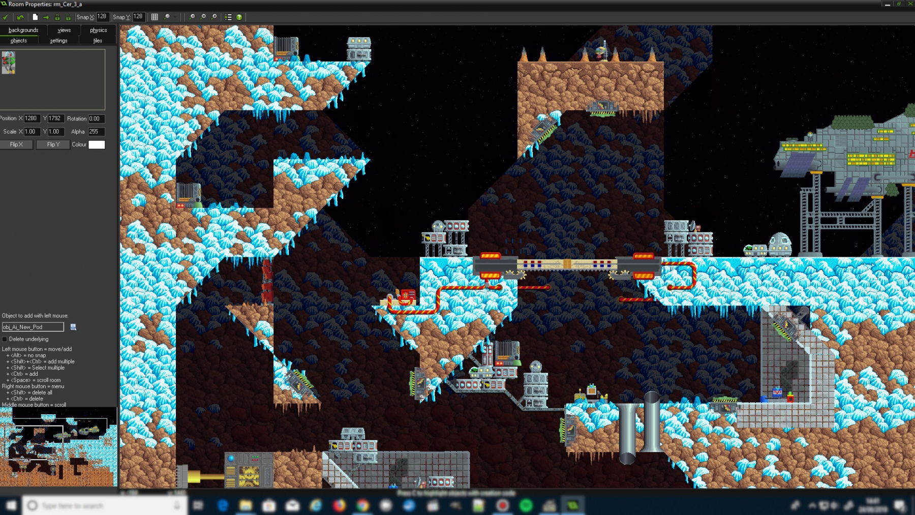 The first stage of construction was to place the tiles that defined the level. The level is set on the surface of Ceres, so it uses the ‘Ceres Surface Ice’ tileset. To ensure some visual variation and to give the player and indication of the depth I used the ‘Ceres Deep Rock’ tileset for the lower half of the level.