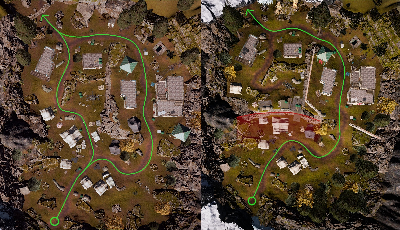 • Blocked off the main gate to redirect the player around the to left, making full use of the physical space.
