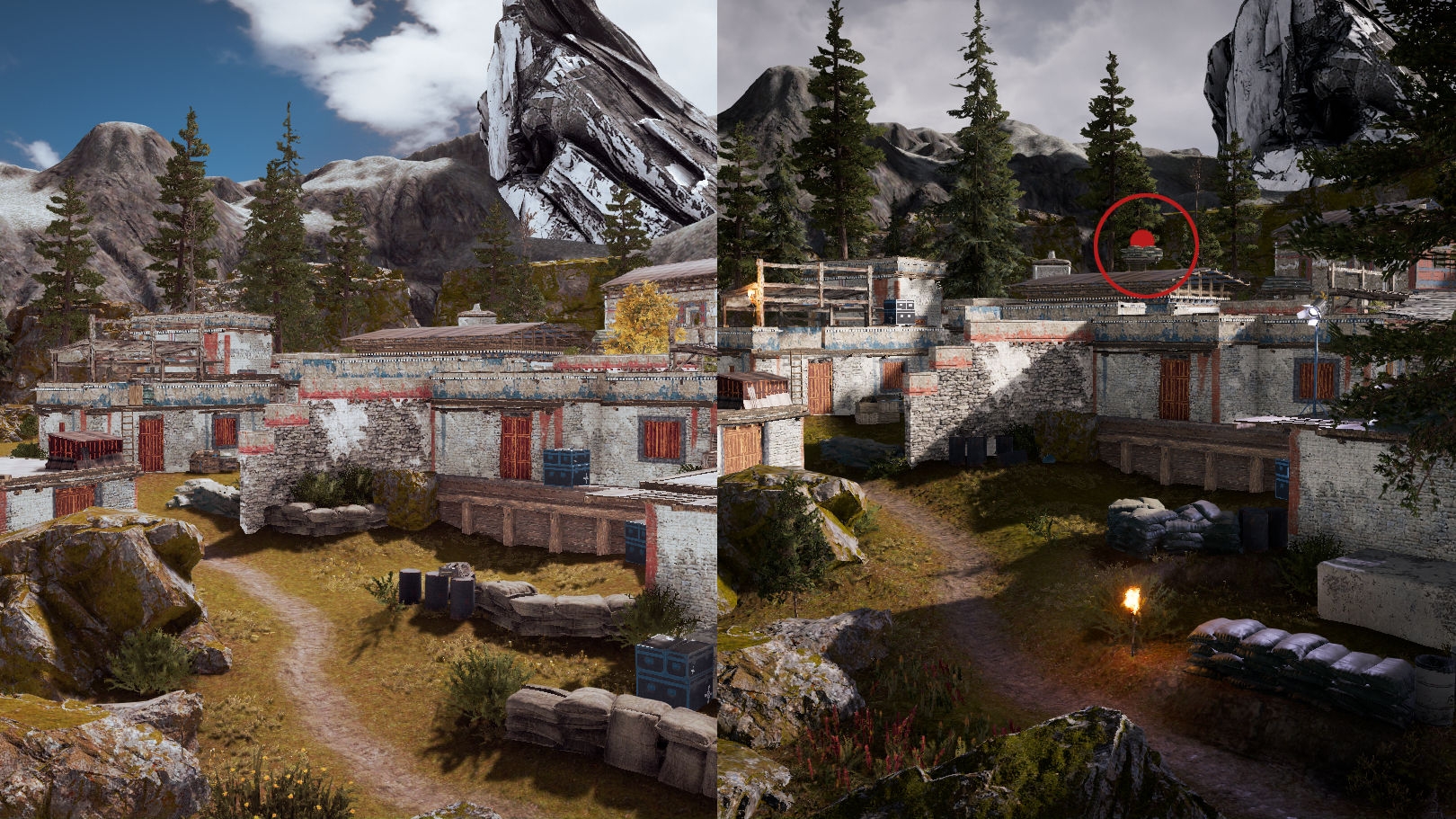 - Changed the buildings on the side-path to a multi-tiered rock and vegetation structure to create more interesting combat.
