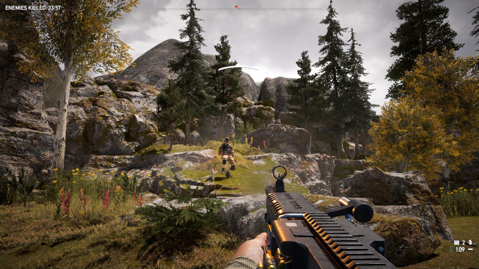 The level is set on a crisp morning in the alpine north of the fictional country of Gorkovia. The natural environment of each area features moss covered rocks and verdant pine forests. Each encounter area then has human encroachment in the centre with buildings and detritus.