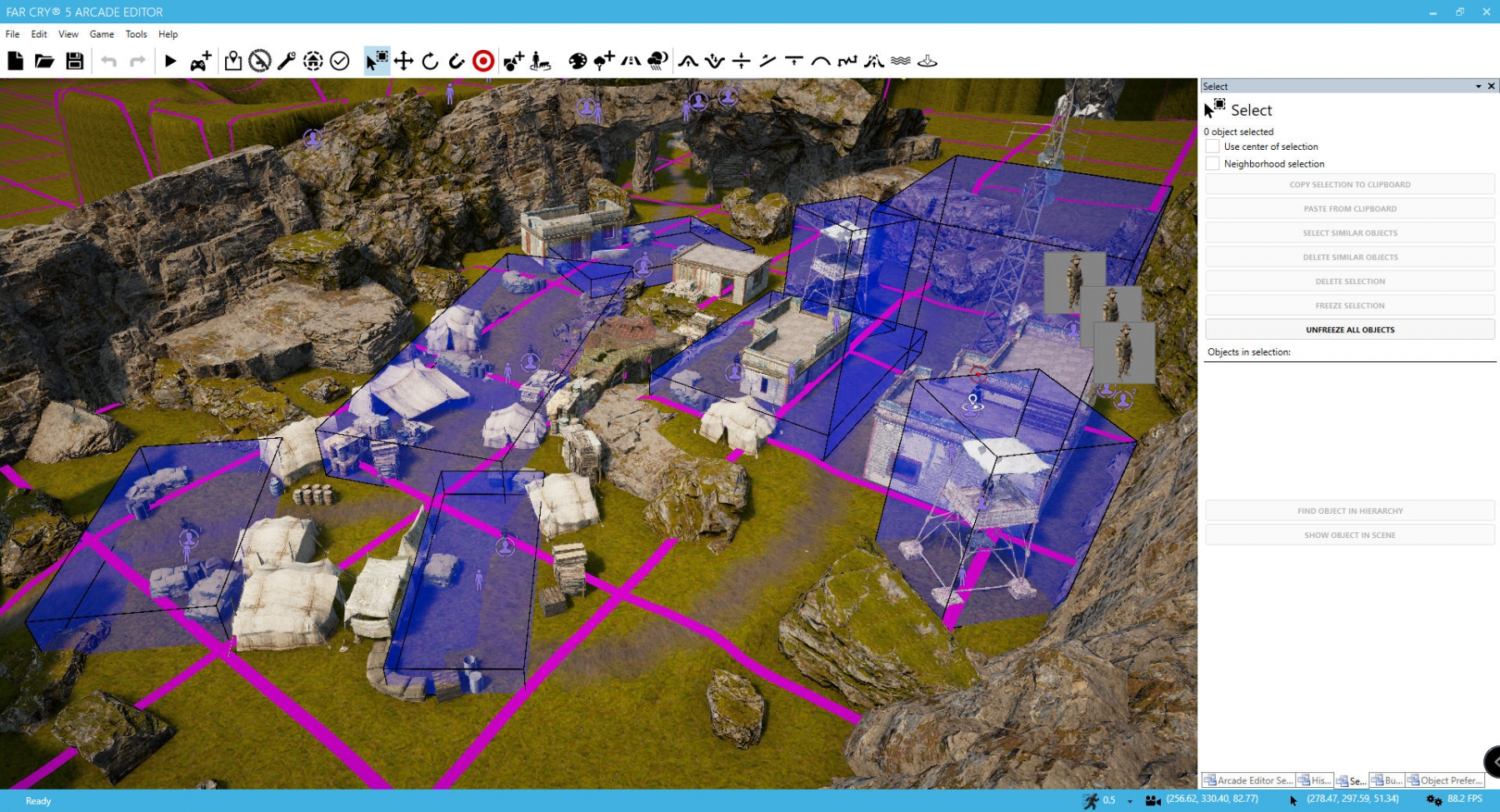 I began by defining the outer walls that constrained the environment and placing the key objects within this area, matching the positions with the editors grid to the design.