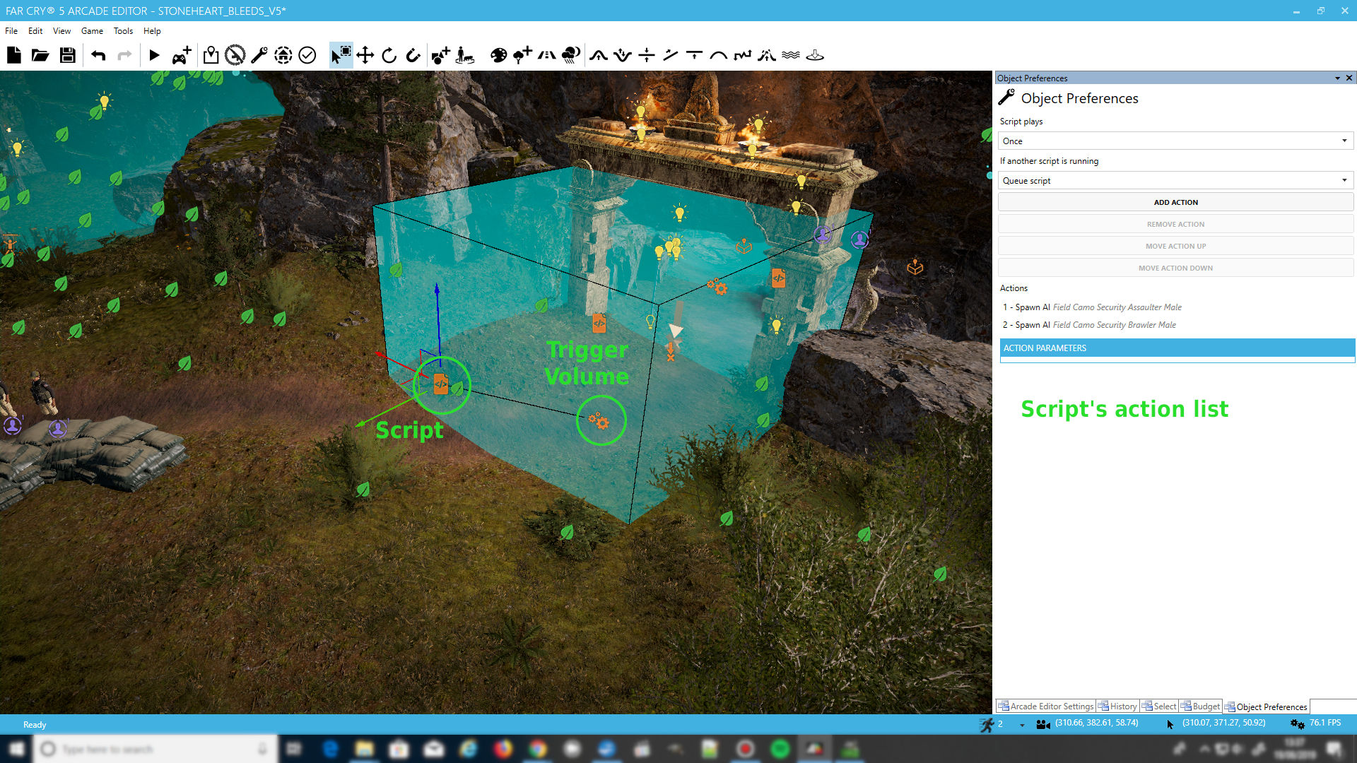The method of scripting used by Far Cry is to place script objects within a scene. These come in two main types, triggers and scripts. Triggers are either events, volume, or ‘look ats’, and they are assigned a script. The script itself is a less of action that you select variables for.