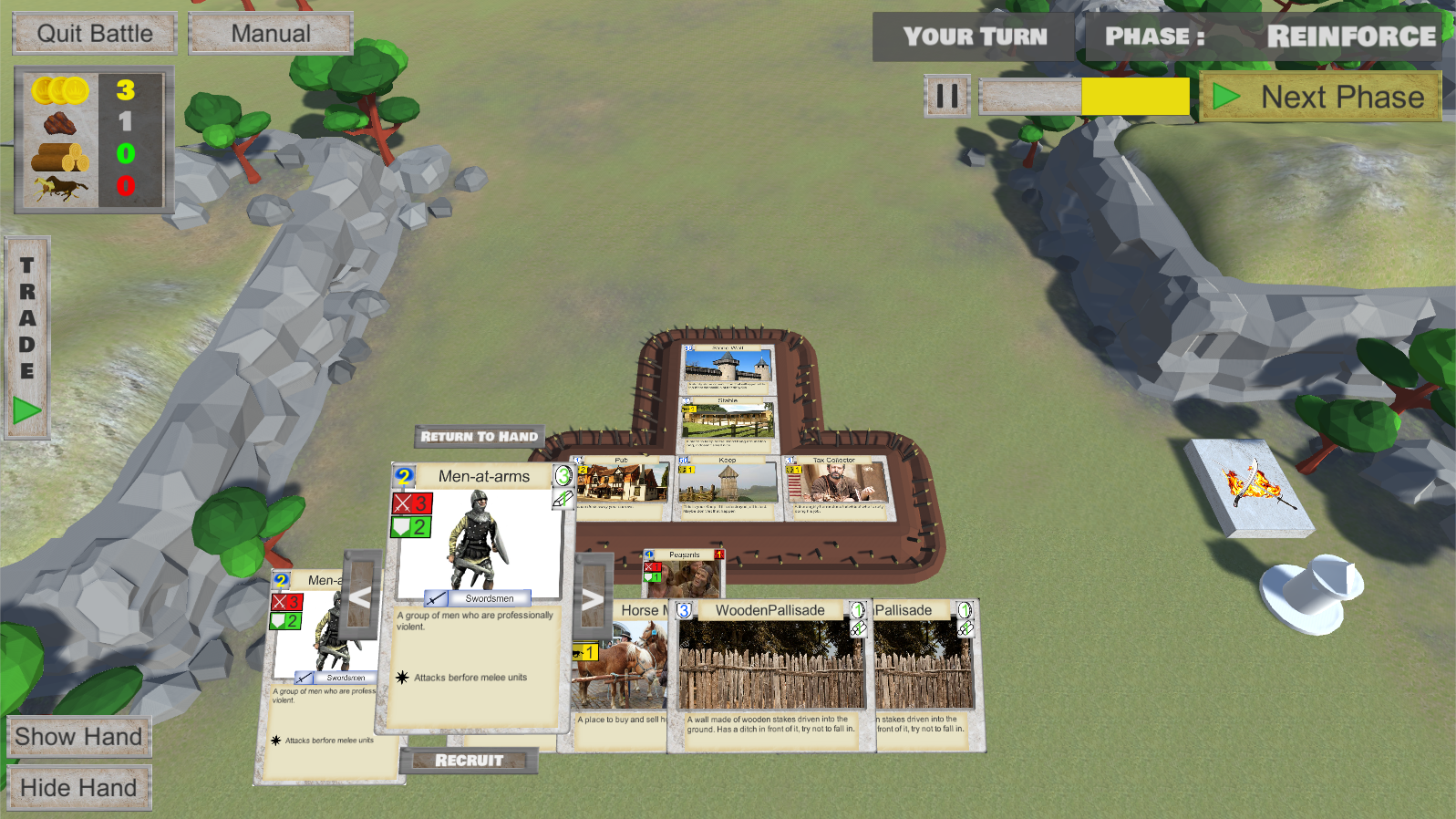 The player builds a deck by collecting units, buildings, and ploys, which they take into a match. Buildings are placed adjacent to each other to build a castle that provides resources. These resources are then used to recruit unit cards into the player’s army. Armies are then sent against an opponents castle to destroy their buildings and break through to the fort to bring the opposing warlord down.