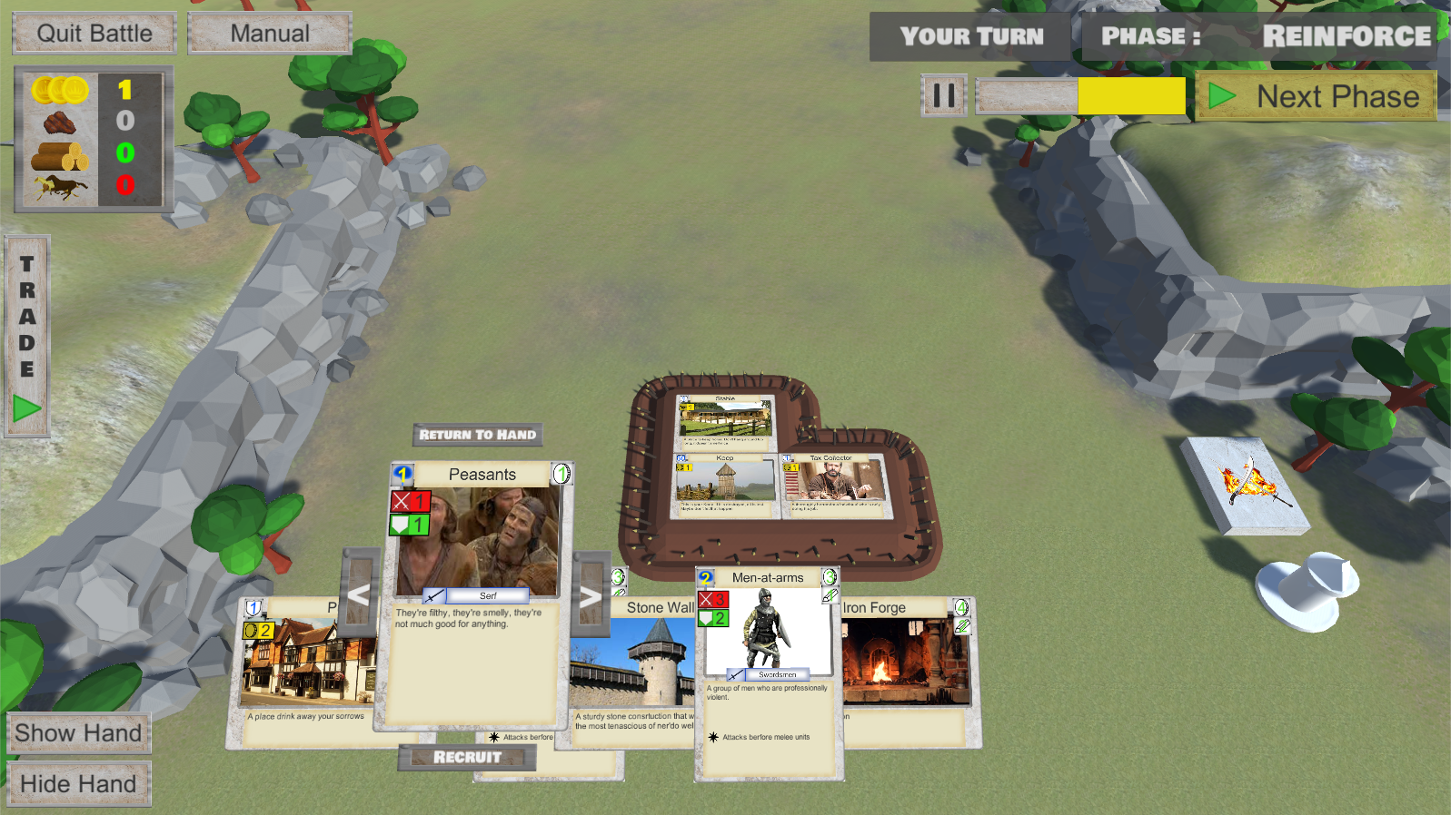 The player builds a deck by collecting units, buildings, and ploys, which they take into a match. Buildings are placed adjacent to each other to build a castle that provides resources. These resources are then used to recruit unit cards into the player’s army. Armies are then sent against an opponents castle to destroy their buildings and break through to the fort to bring the opposing warlord down.
